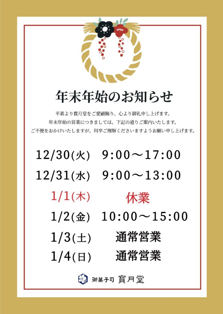 年末年始の本店の営業時間、および商品発送につきまして、下記の通りご案内いたします。