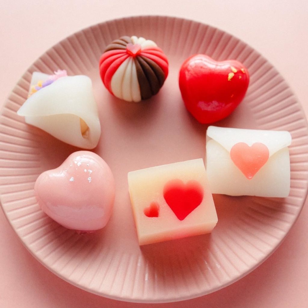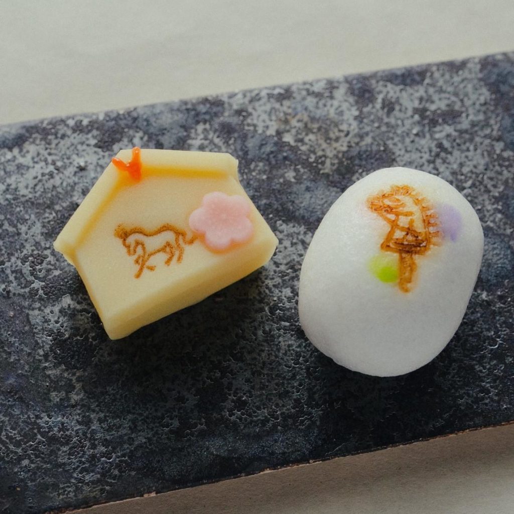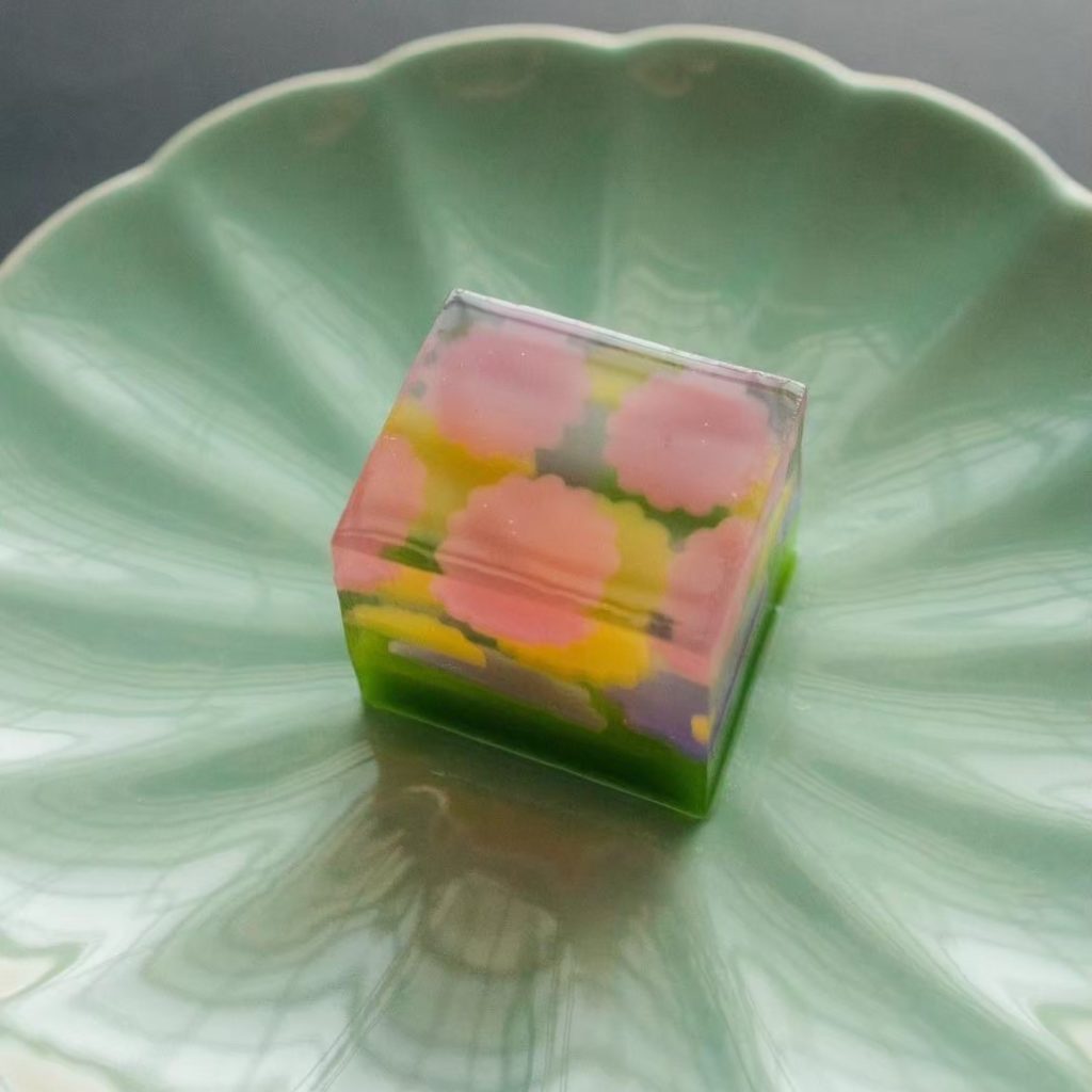 細工の細やかさ、色の使い方を堪能できるように作られた生菓子。お客様の心に通じるおもてなしができますように願いをこめて作っております。季節の移ろいにつれて彩り、姿をかえ、自然を感じられる一品となっております。